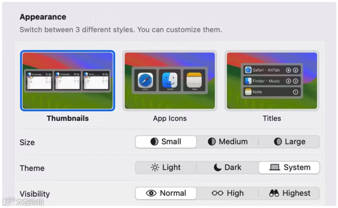 直观窗口预览这和 macOS 原生只能看应用图标的切换方式完全不同,AltTab 可以直接显示所有打开窗口的实时缩略图,你一眼就能找到想要的那个页面或文档,尤其在同时打开十几个窗口时,这种视觉定位比记忆和盲扫高效太多
