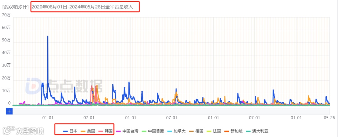 点点数据显示,2020年8月至今,该作在海外双端总流水预估为6.56亿元,日本、美国、韩国分别以40.66%、21.64%以及8.83%位列贡献榜TOP3,但已趋势来看,其月流水已经从顶峰的3920万下降至1000万出头,4月更是只有680万。