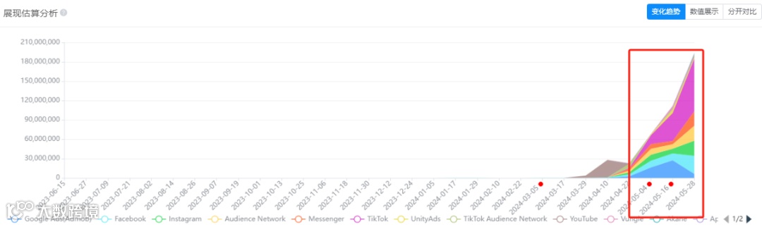 国内投放节奏与海外基本保持一致,上线前素材投放量在三位数左右,公测前两天开始上升至1000组左右,公测当天猛增至5000组。