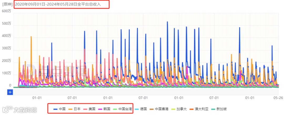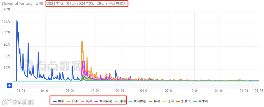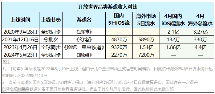 首先来看2021年12月上线的《幻塔》,其并非全球同步公测,海外版上线延迟近两年,但将国内5日iOS端流水与海外版上线前5日双端流水数据综合来看,其数据表现实际上与《鸣潮》几乎一致,唯一的不同在于《幻塔》国内iOS端5日流水是《鸣潮》的两倍。