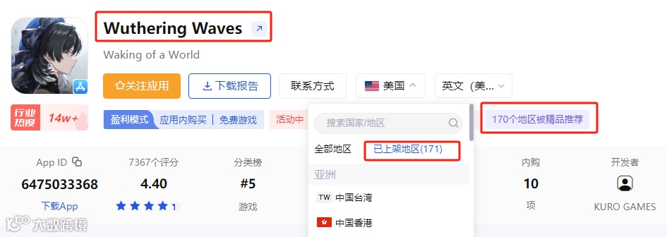 点点数据显示,5月21日预下载开启的当天,《鸣潮》便冲上了159个国家及地区的iOS游戏免费榜TOP10(其中位于107个国家及地区TOP1),公测当天位于106个国家及地区免费榜TOP10,48个国家及地区iOS游戏畅销榜TOP20。