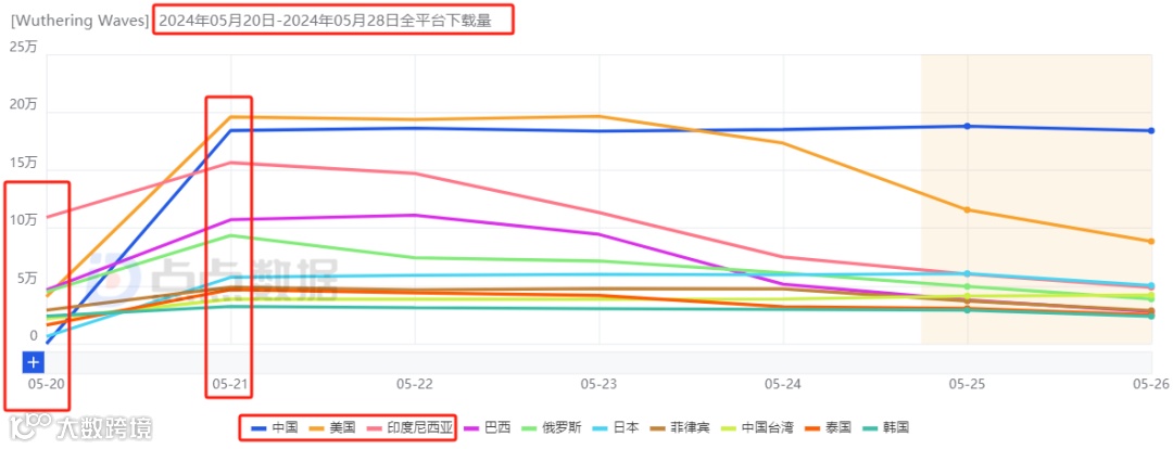 下载量方面(不包括PC端及国服安卓端),实际上游戏在正式预下载的前一天(5月20日)便在部分重点市场“悄悄”开放了下载,跑出55万的下载量。