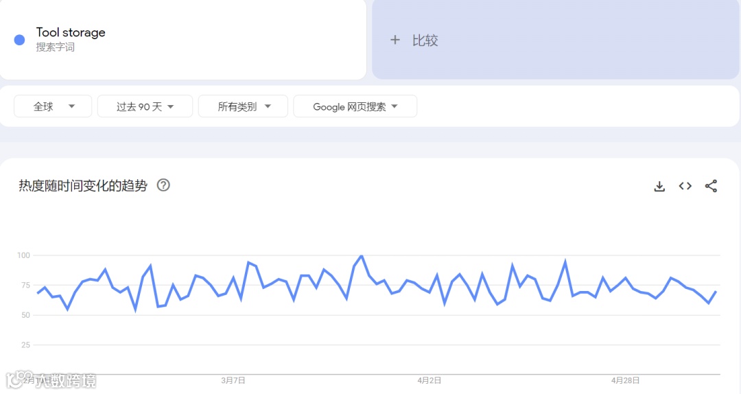 谷歌趋势显示,“Tool storage”(工具收纳)过去90天全球搜索热度达50—100,基本持续处于75以上。
