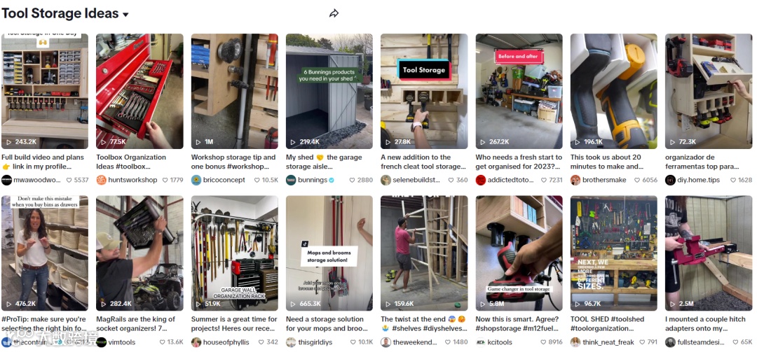 据Shoptop观察,TikTok关于#Tool Storage Ideas相关的帖子大约2580万条,海外用户乐于在社交媒体上分享创意收纳、工具区创意、存储创意、新工具创意等相关内容。