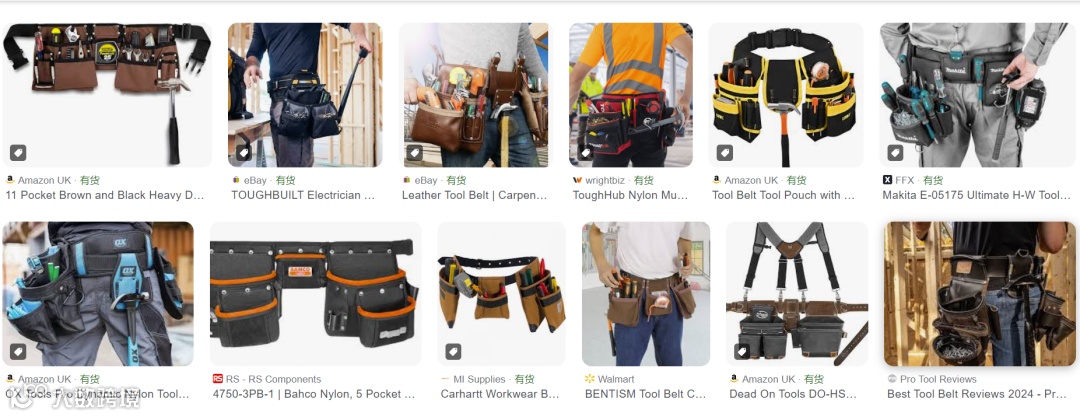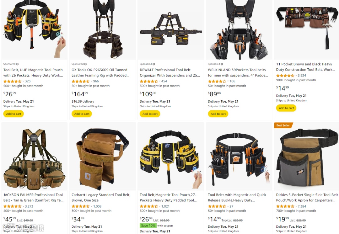 其中,工具腰带在亚马逊上种类多样,各种款式功能一应俱全。其价格主要在14.99美元—164.99美元之间,依据工具腰包的功能价格不一。畅销款折扣后价为19.99美元,适合建筑工人、木匠等人群使用。