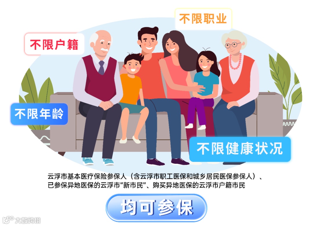 参保对象:不限年龄、户籍、职业和健康状况,老少同价,云浮市职工医保参保人还可使用医保个人账户余额为本人及直系亲属缴费。