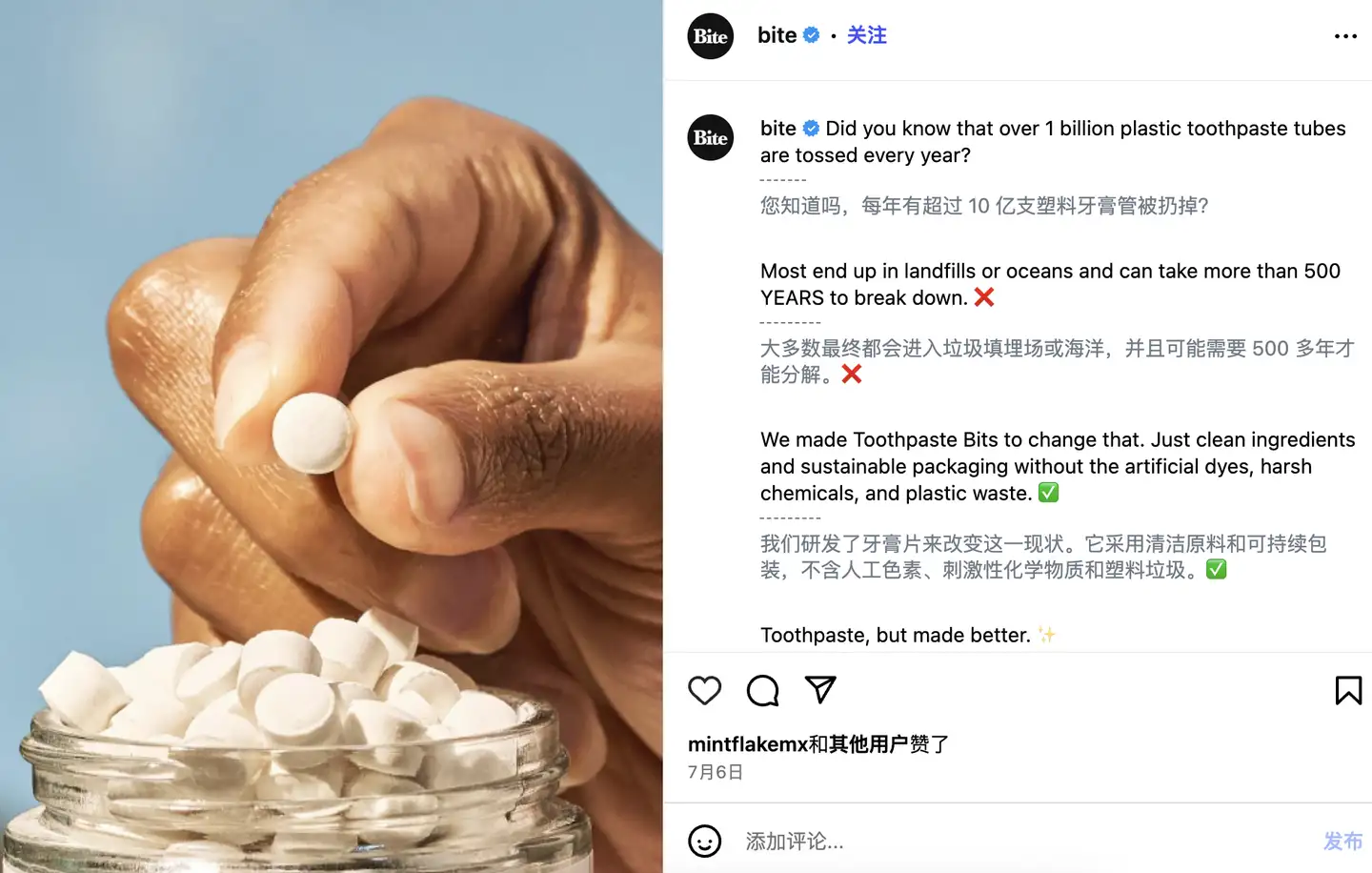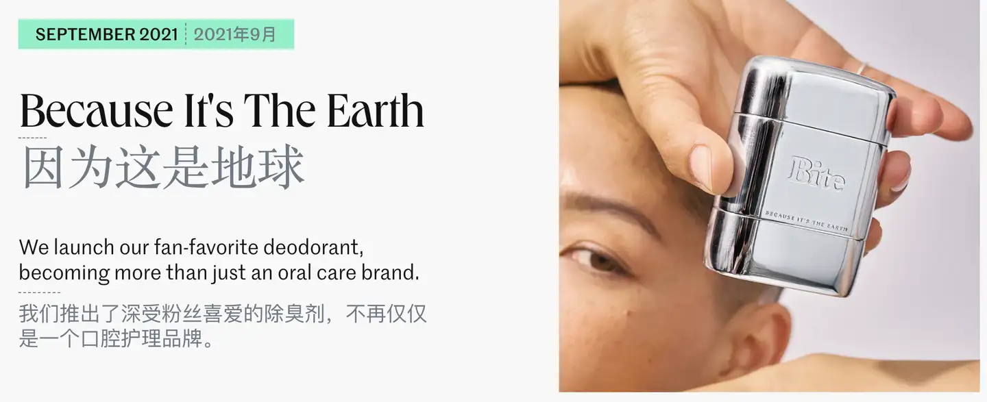 Euthymol的这款牙膏在国内可是老网红了,早在2015年就在各大社媒火过一圈。它是一个拥有近200年历史的英国经典口腔护理品牌,通常这种百年老牌都有一个“品牌使命”,Euthymol的使命是倡导自信态度,鼓励展示真实自我。同为口腔护理品牌,Bite Toothpaste Bits的使命就显得“朴素”得多——在日常生活中消除一次性塑料。