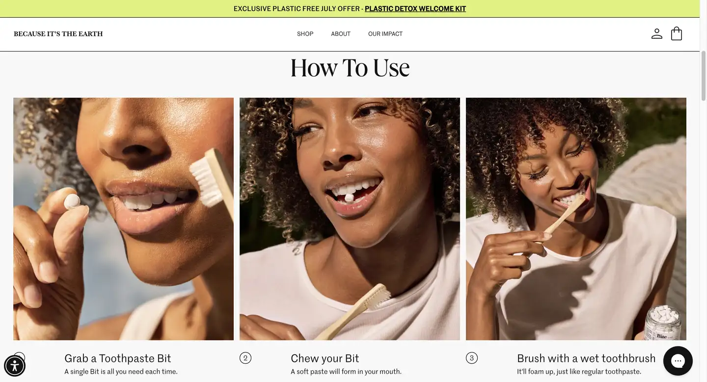 除了危机教育之外,Bite还格外注重产品教育,以降低接受门槛。品牌制作了许多科普视频和常见问题解答,甚至独立站首页第二屏用了一整屏的位置展示how to use,用清晰、简洁的图文组合来解释产品如何使用。通过塑料污染危机来引发消费者对环保产品的关注,然后用高透明度的产品教育内容来消除疑虑,这是创新类产品非常值得借鉴的用户教育策略。