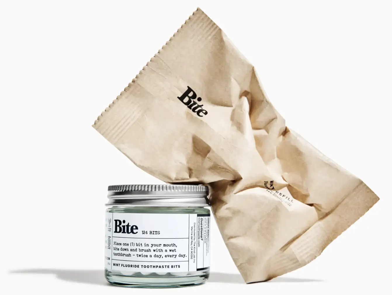 Bite牙膏片经咀嚼后接触牙刷会像普通牙膏一样起泡,使用体验与普通牙膏几乎没有区别。制成牙膏片的原料为纯天然成分,不含人工防腐剂、香料和甜味剂等添加物;并且,它采用完全可回收的玻璃罐包装,可重复使用。