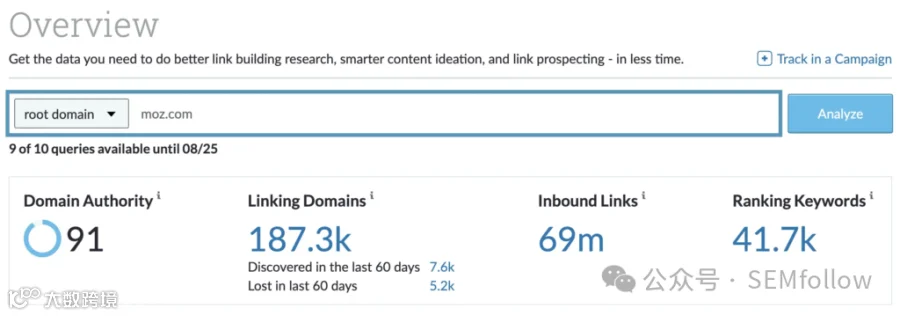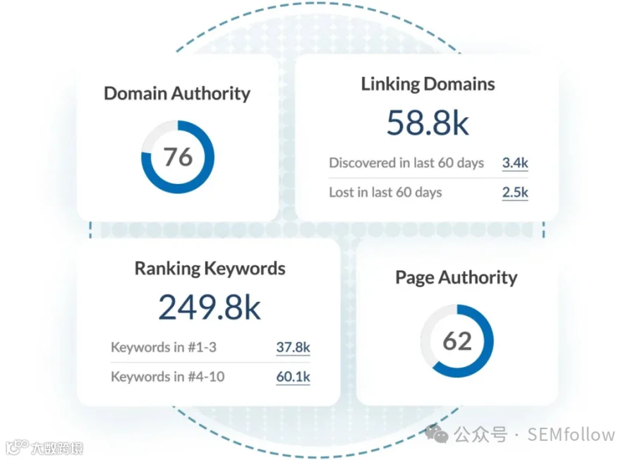 Moz的Domain Authority (DA)采用机器学习模型预测网站排名能力,同样为0–100分制。其评分机制具备对数特性,即低分段提升容易,高分段突破难度大。