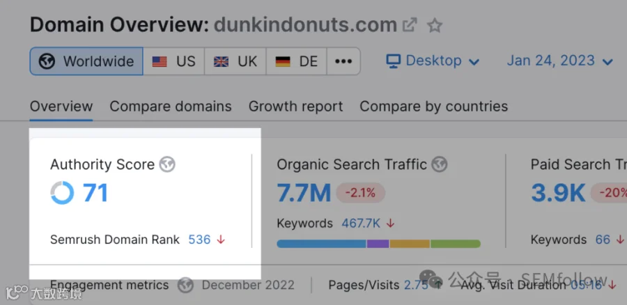 Authority Score是SEMrush用于评估网站SEO质量的综合性指标,满分为100分,数值越高代表权威性越强。其评分基于三大核心维度: