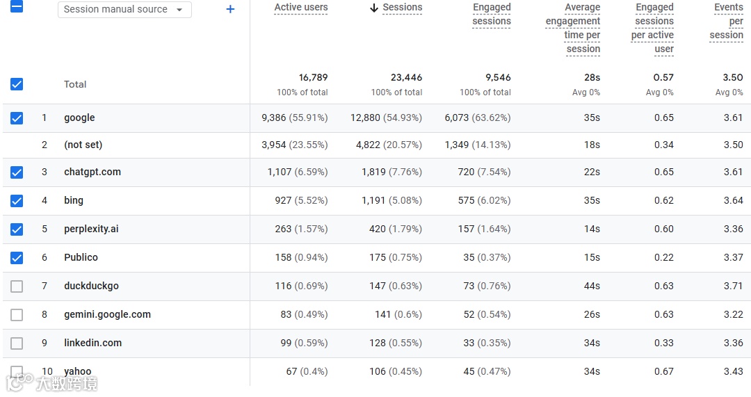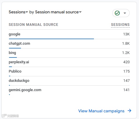 尽管Google仍是主要流量来源,但来自ChatGPT、Perplexity、Gemini等AI搜索的流量正逐步增长。