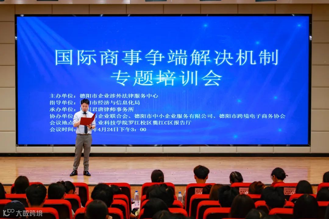2025年4月24日下午,由德阳市企业涉外法律服务中心主办、德阳市跨境电子商务协会(简称“德阳跨协”)协办的“国际商事争端解决机制”专题培训在四川工业科技学院成功举办。活动吸引了百余名来自德阳市的涉外企业代表、法务人员、律师及高校师生参与。