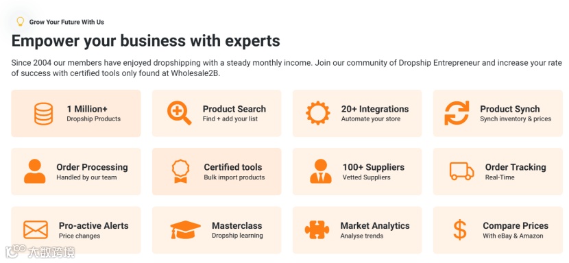 Wholesale2B集成了100多家代销公司和100万+代销产品,主要销售地为美国、加拿大和英国,Wholesale2B开发的直销应用程序支持将产品导入至eBay、亚马逊、Shopify、BigCommerce、WooCommerce、Weebly、Ecwid等平台,同时可以通过Wholesale2B创建独立的直销网站。