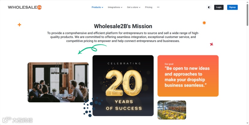 Wholesale2B(简称W2B)是隶属于OnlineStoreBiz.comLLC的Dropshipping(一件代发)平台,成立于2004年,最初是一家软件开发公司,专注于开发代销软件。Wholesale2B是一个专为在线零售商设计的代销平台,主营批发直销产品和直销销售工具,为商家提供产品采购、订单处理、退货处理、上传工具、导入工具和CSV文件等服务。