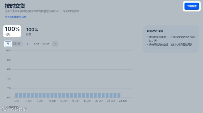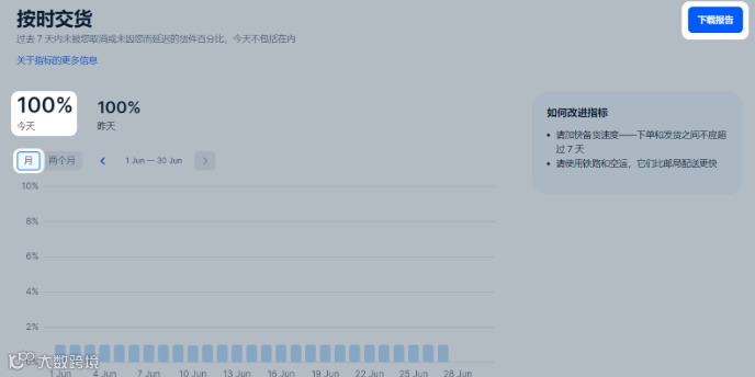 按时交货率指在规定时间内交付给买家的订单占比,统计周期为最近7天(不含当日)。该指标无封锁限制,但建议维持在80%以上。