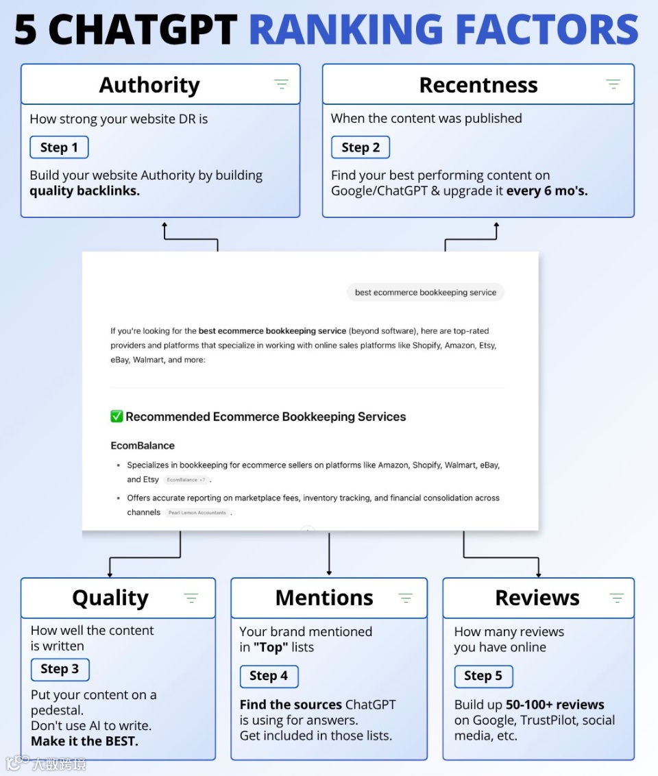 影响内容在ChatGPT等大语言模型(LLM)中被引用的五大核心因素包括:域名权威性(DR)、内容时效性、内容质量、品牌提及度及网络评价数量。