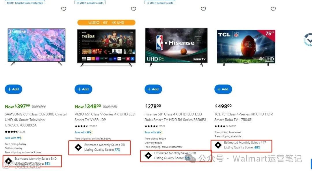 打开沃尔玛产品页面时,使用插件可展示多种数据信息,从左到右依次为区间价格、区间销量、价格、产品曝光量、预计当月销量、预计当月销售额、评分、评论数量及Listing分数。