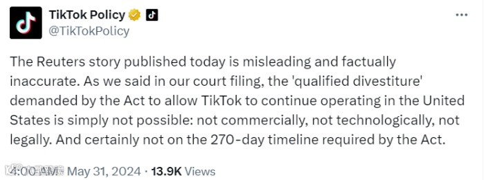 当地时间5月30日,有市场消息称,TikTok正开发其核心算法的“美国版本”。一旦代码分开,则有望为字节跳动美国资产的剥离奠定基础,尽管该公司目前并无此计划。TikTok对此在社交媒体平台X发文回应称,相关报道具有误导性且与事实不符。TikTok表示,TikTok剥离法案要求的允许TikTok继续在美运营的“合格剥离”在商业、技术和法律上都是不可能的,并且“肯定不可能在该法案要求的270天时限内完成”。(界面)