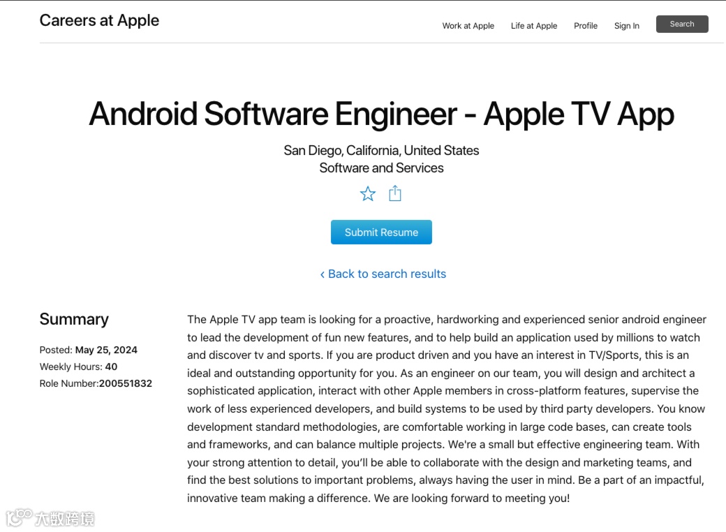 彭博科技记者马克·古尔曼表示,苹果公司正在招募一名高级工程师来帮助开发一款适用于安卓的电视和体育应用程序,这表明该公司终于将其TV+服务引入了竞争对手的智能手机平台。在最近几天发布的招聘信息中,苹果表示,正在寻找能够领导开发“一款数百万人用来观看和发现电视及体育节目的应用程序”。