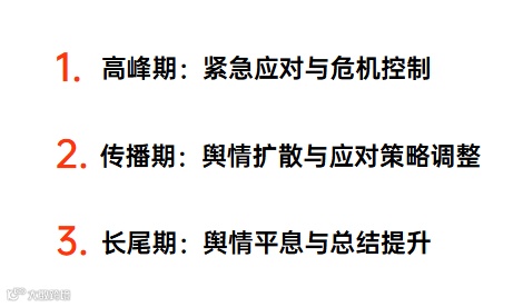 舆情处理三阶段:高峰期、传播期、长尾期,各阶段处理时效一般为1-3天,实际时间视具体情况而定。