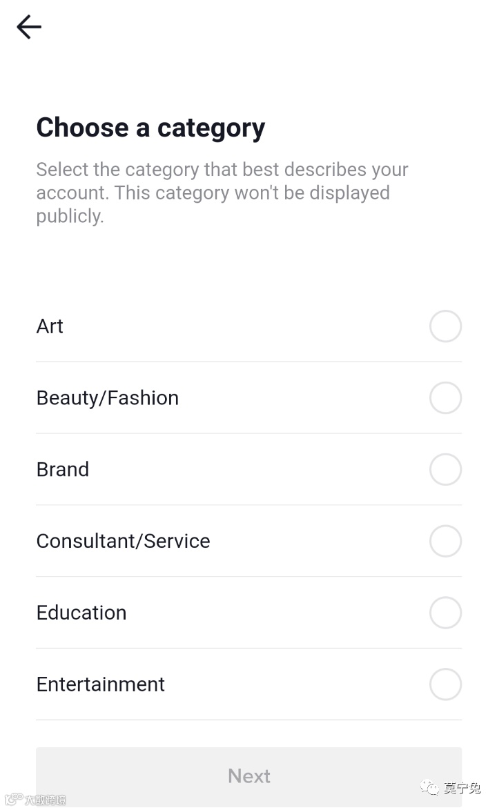 选择“Creator Account”或“Business Account”,根据提示完成类目选择、性别填写等信息设置。
