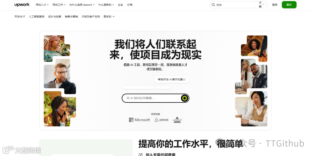 Upwork是全球领先的自由职业平台,连接来自欧美等地的客户与全球自由职业者,涵盖写作、设计、编程、翻译等多种技能领域。该平台由Elance与oDesk合并而成,运作模式类似于“国际版猪八戒网”,但以美元结算,为具备专业技能的人才提供跨境变现机会。