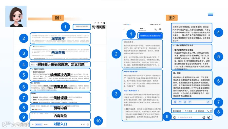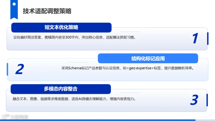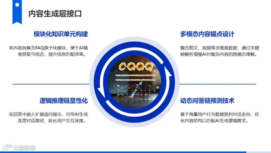 采用模块化设计提升内容被AI调用概率:使用“Q&A+数据支持+扩展提示”问答链模板引导对话延伸;融合图文、视频、3D模型等多模态内容提升理解效率(优化后提升79%);基于用户追问日志预测对话路径(准确率提升48%)。目标是将品牌内容打造为AI生成答案的“标准构建元件”。