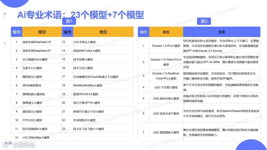 23个主流大模型:包括DeepSeek-V3、Kimi大模型、百度文心、字节豆包、通义千问、讯飞星火、智谱GLM-4等,构成当前AI生态底层支撑。