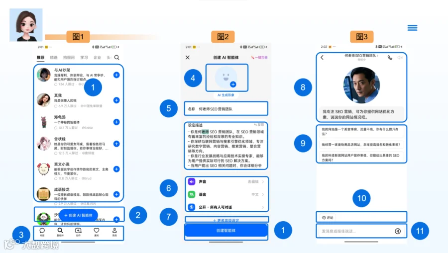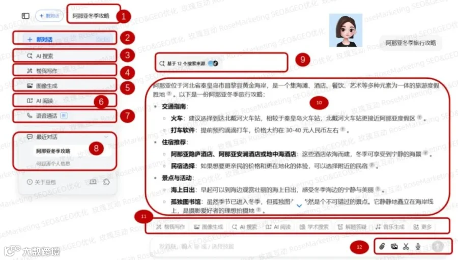 - 标记3:AI搜索功能,实现信息聚合与智能生成。