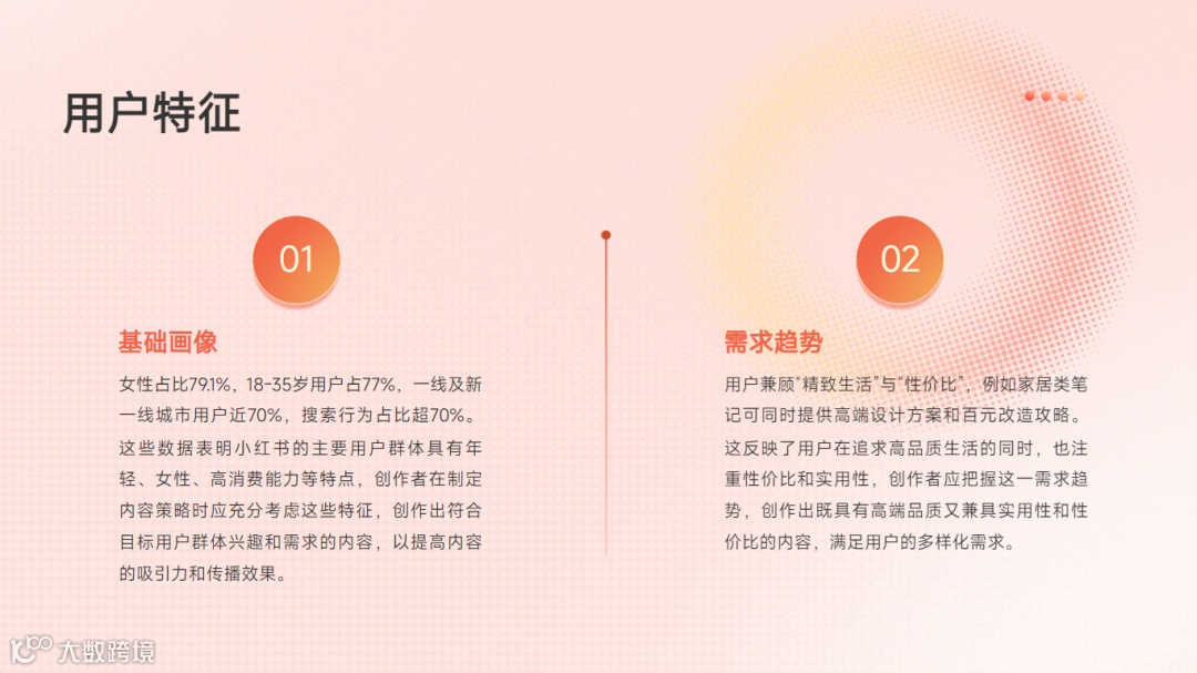 基础画像:女性占比79.1%,18-35岁用户占77%,一线及新一线城市用户近70%,搜索行为占比超70%。