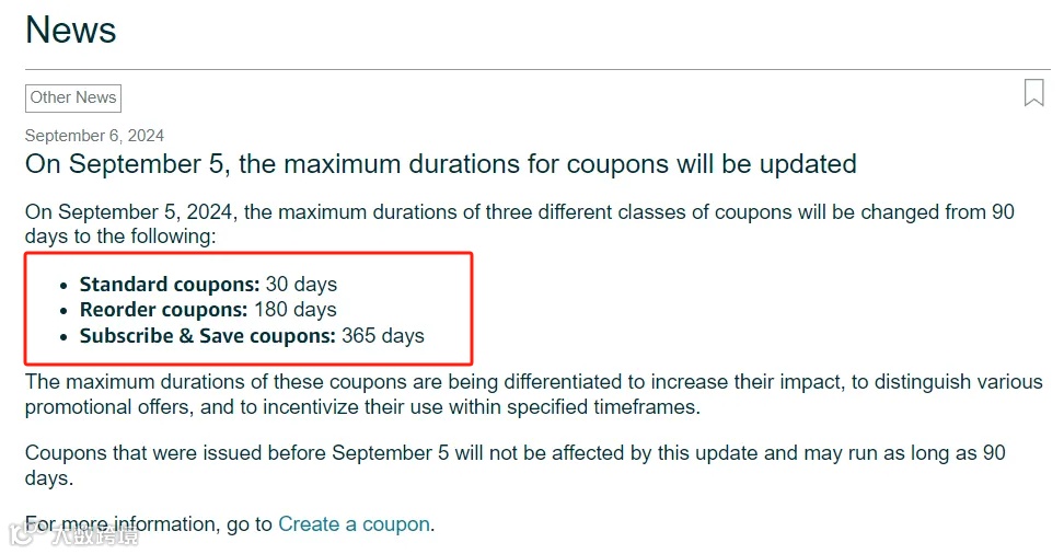 自2024年9月5日起,亚马逊对三类优惠券的最长有效期进行调整: