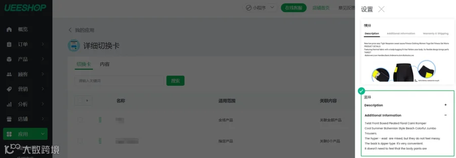 Ueeshop详细切换卡功能,可为产品添加多个产品描述,更加全面地展示产品不同方面的信息,从而帮助卖家提升消费者信任度。此外,该功能还支持设置排版样式,卖家可根据潜在顾客的习惯来设置,以提升用户浏览体验。