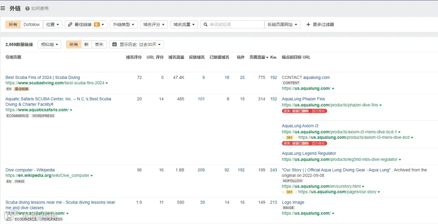 外链为Aqualung官网贡献了较多流量,因此其外链策略还是非常值得借鉴的。根据ahrefs分析显示,Aqualung将外链大多布置在了资讯网站、博客网站、测评网站以及友商网站上。
