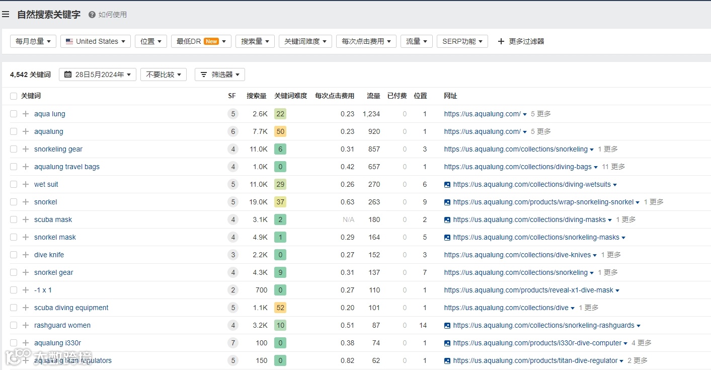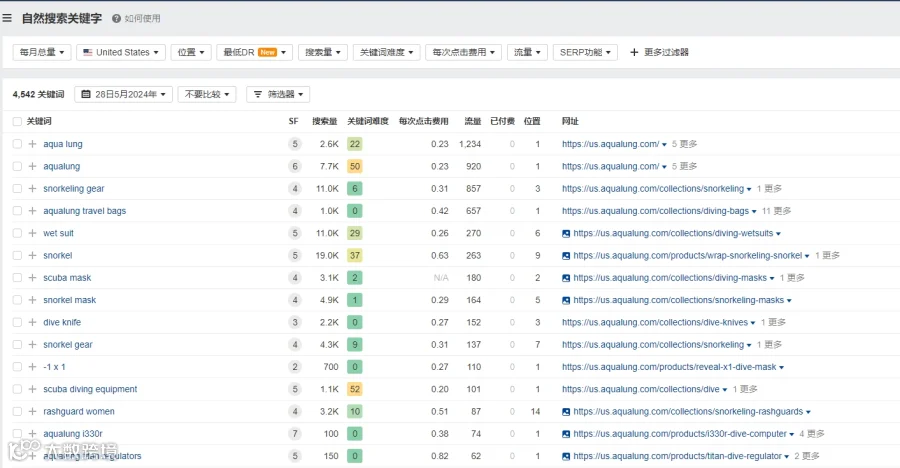 根据ahrefs分析显示,Aqualung选择的关键词是非常广泛的,包括各种潜水装备细分品类,这是能够覆盖更加广泛的受众群的。