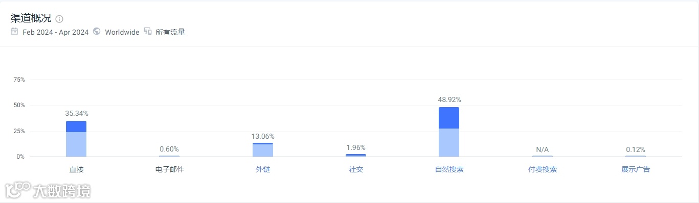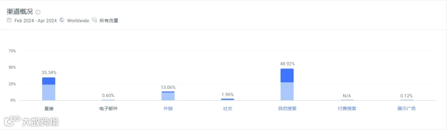 根据similarweb数据显示,Aqualung官网的流量主要来自于自然搜索流量(48.92%)、直接访问流量(35.34%)、外链(13.06%)。