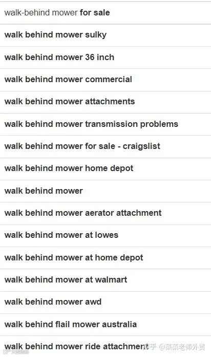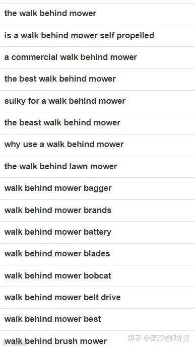 以“walk-behind mower”为例,通过工具分析可发现客户真实需求涵盖产地偏好、价格比较、品牌对比及配件信息等维度。