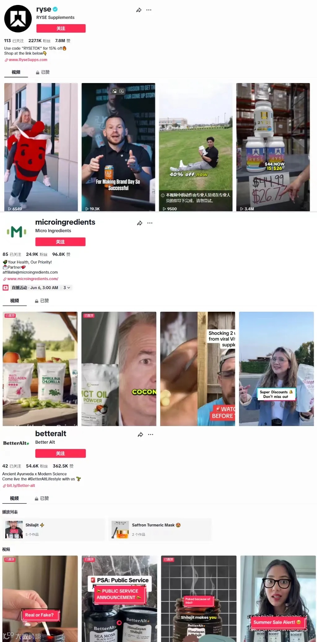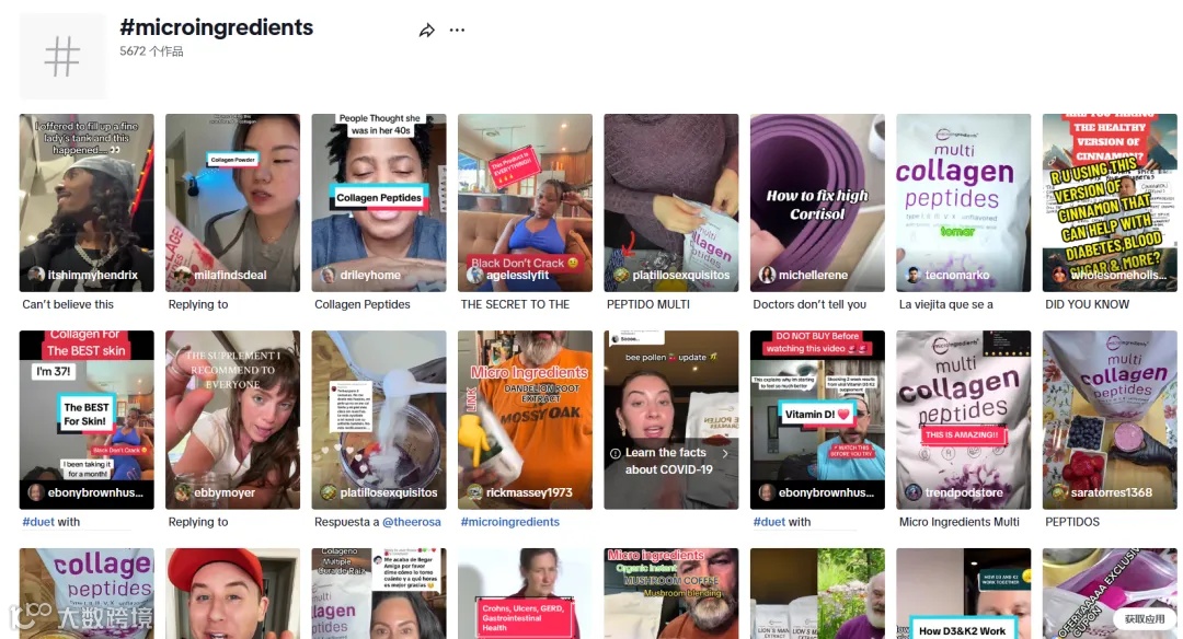 从广告投放的媒体渠道上看,他们均与TikTok达人合作密切。#Micro Ingredients 和 #BetterAlt 话题下均有6000左右作品,#Rysesupps 更是高达两万余个。