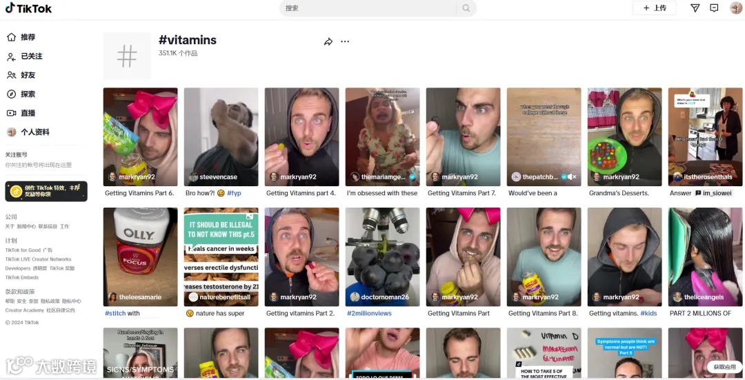 而近期,保健品这一类目在 TikTok 持续爆火。这两类成了主力军,光是# vitamins (维他命)这一话题下就有35.1万个作品。