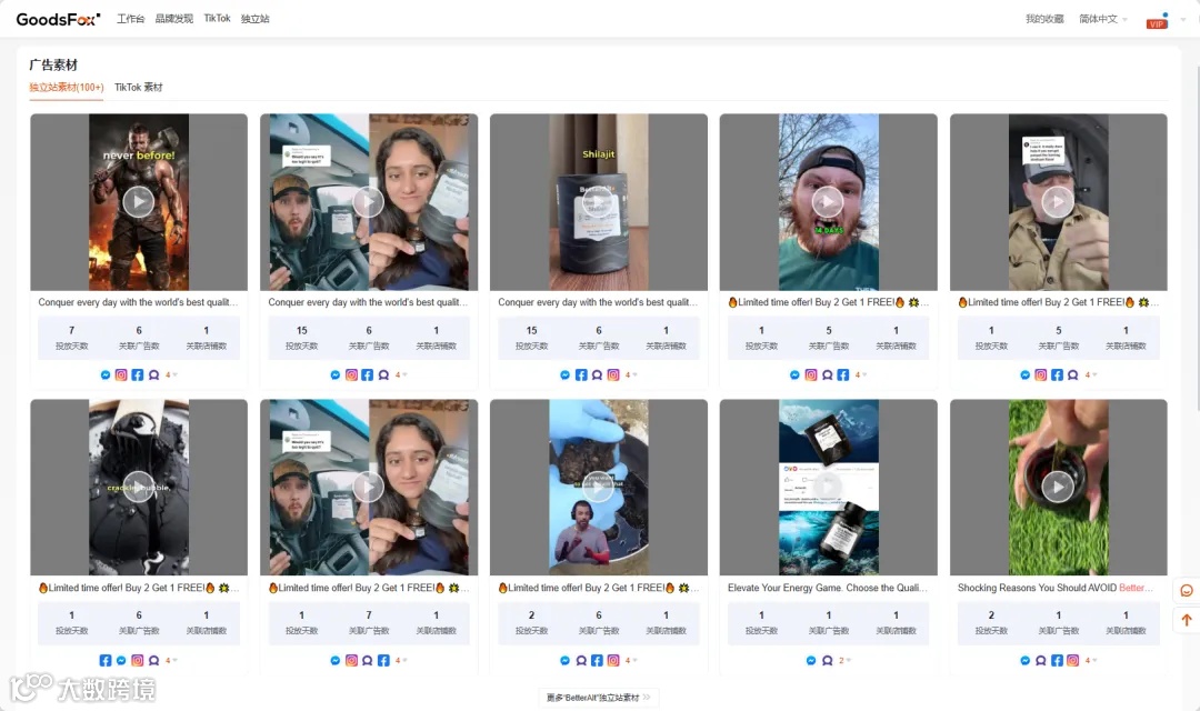 据GoodsFox显示,BetterAlt 在独立站同样投放了许多素材,超过100个,而 Rysesupps 和 Micro Ingredients 仅有10余个。