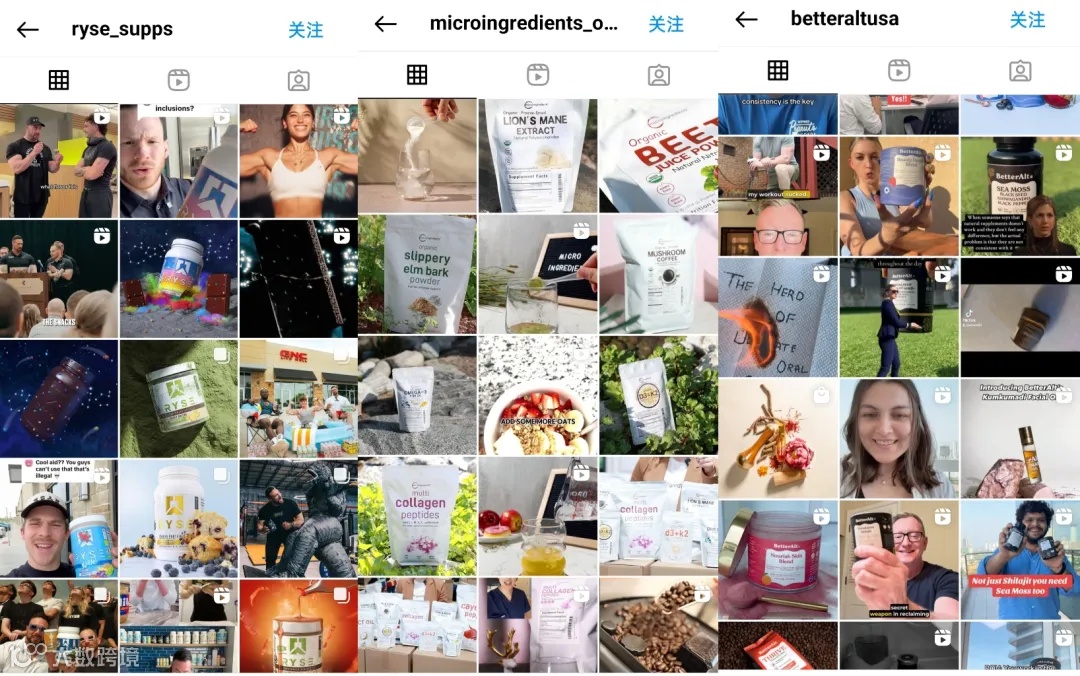 Ins方面,Micro Ingredients 的 Ins 粉丝量为1.8万,以产品精美拍摄图为主,仿佛在告诉用户,“想要拥有同款精致生活吗?买它就够了!”;Rysesupps 粉丝量为33.2万,以高颜值的肌肉模特和产品同框为主,帅哥美女吸睛能力拉满,还能显产品功能;BetterAlt 的Ins粉丝量为2235,以真人出镜的口播视频为主,比较直白。