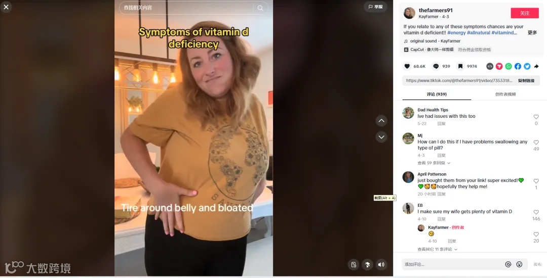今年4月3日,TikTok博主 @thefarmers91 一则简单直白的视频,直接将Micro Ingredients旗下一款维生素产品送出圈,该视频获得了400万观看量和6.86万点赞。视频下面的近千条评论中,网友纷纷表示自己和自己身边的人都有这种症状,甚至直接求购买链接。
