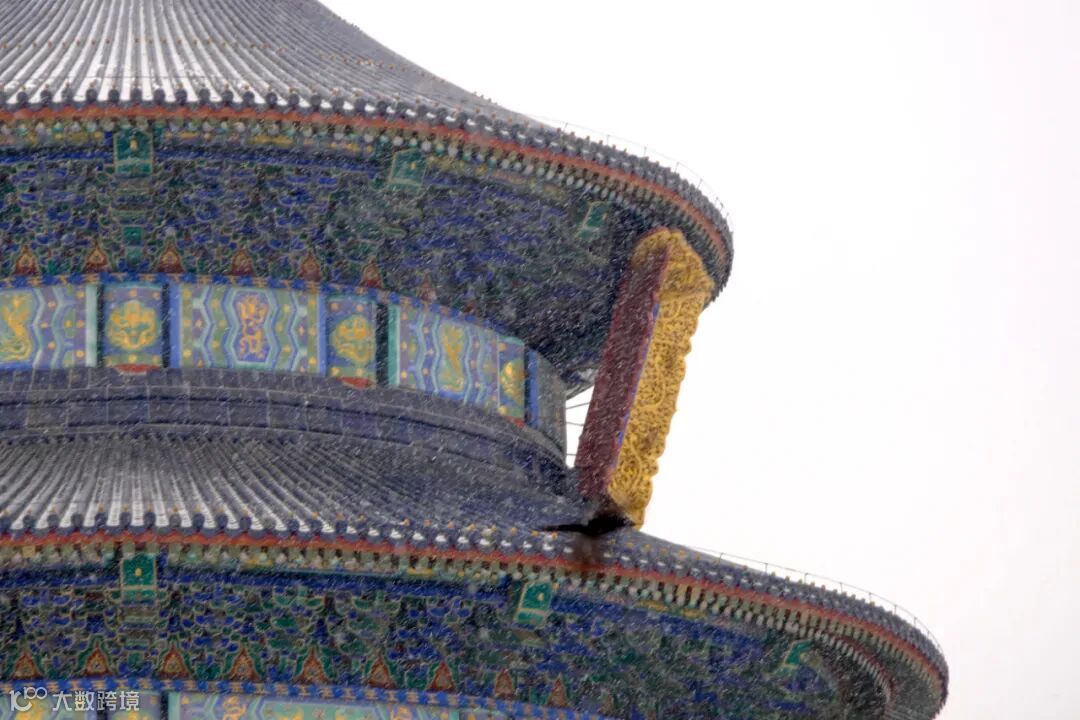 大雪时节,雪落在祈年殿宝顶,红墙、白雪、蓝色琉璃瓦,庄严大气,犹如天地之间在对话,令人心生敬畏。