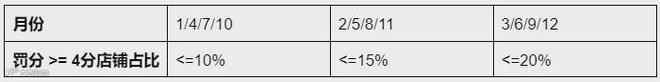 卖家上月罚分>=4分的店铺/卖家总店铺数的比例 (PP%)需达到以下标准: