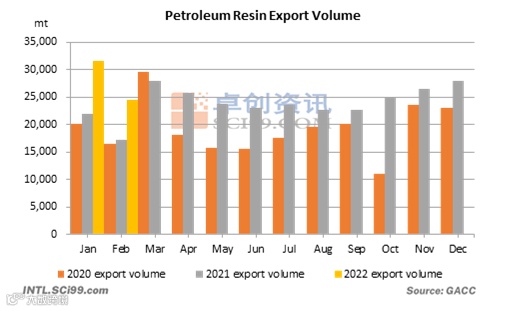 From January to February 2022, China’s petroleum resin export volume totaled 56.117kt, up 43.51% Y-O-Y.