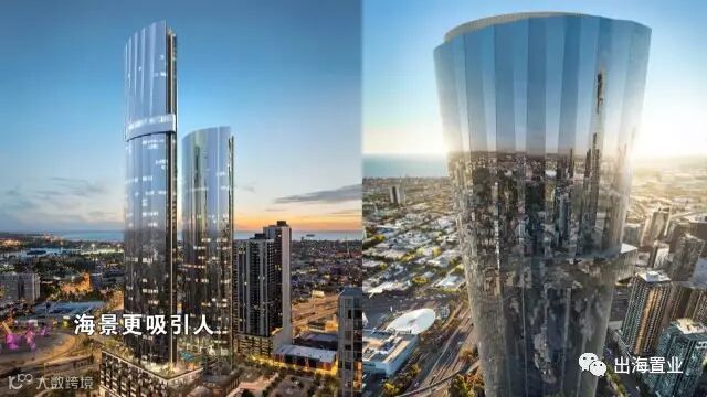“我们项目就是标M的这两栋双子楼,这是从整个墨尔本南面往那边望过去的感觉。我们这个项目所有朝南的户型其实是可以看到海平面的,北边是河景房,南边是海景房。从实际角度说海景更吸引人,这个项目到海边的距离差不多在三到五公里左右。”