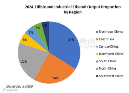 In 2024, the edible and industrial ethanol output in Northeast China declined, while that in East China, Central China, and Northwest China rose.