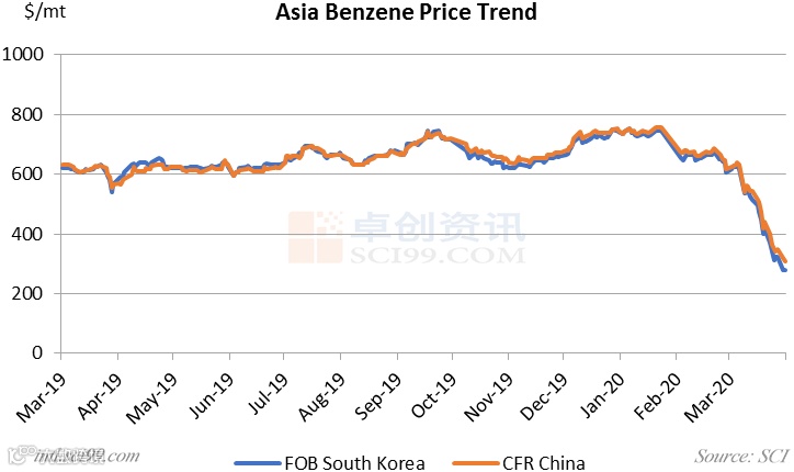 As of March 30, benzene prices FOB South Korea reached $275-285/mt, down $355-360/mt M-O-M. Benzene prices CFR China reached $310-330/mt, down $320-330/mt M-O-M. The average price was $474.3/mt in the month, down 27.48% M-O-M.