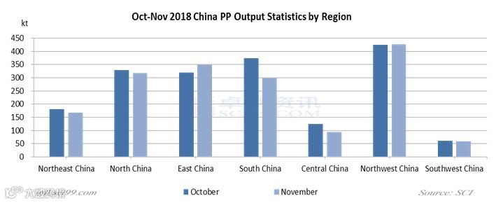 China’s PP output was about 1,710kt in November, 2018, down 100kt from 1,810kt in October. There were not newly added turnaround plans, but about eleven enterprises shut down their units temporarily due to the breakdown. Thus, China’s PP output failed to increase a lot as expected. There are no newly added turnaround plan in December. Shanghai SECCO Petrochemical and Pucheng Clean Energy Chemical have shut down the units temporarily in H1 December, and the restart time has not determined yet. SCI predicts that China’s PP output will inch up in December.