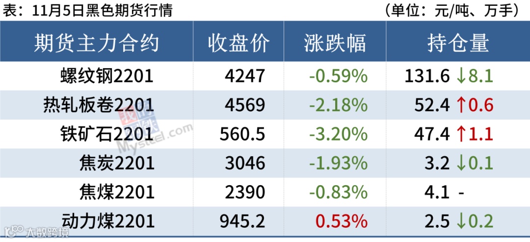 11月5日,全国31个主要城市20mm三级抗震螺纹钢均价5016元/吨,较上个交易日跌68元/吨。短期来看,一方面,尽管近期限电政策有所放松,但北方环保有趋严之势,叠加钢材利润大幅收窄后,部分地区钢厂逐步面临亏损,导致本周建材产量小幅下降;需求方面,近期天气逐渐转冷,钢材迎来消费淡季,预计后期建材需求大概率还将走弱;心态方面,受近期煤焦合约价格快速下跌,导致市场心态偏悲观,看跌情绪浓。综合